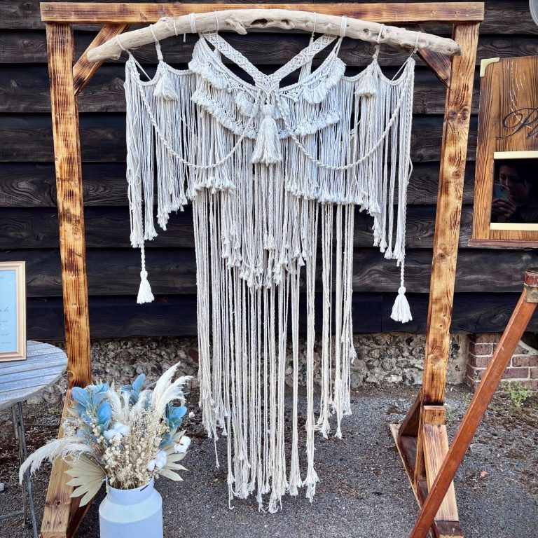 Elevate your event styling with our stunning macrame backdrops or ivory flower wall.